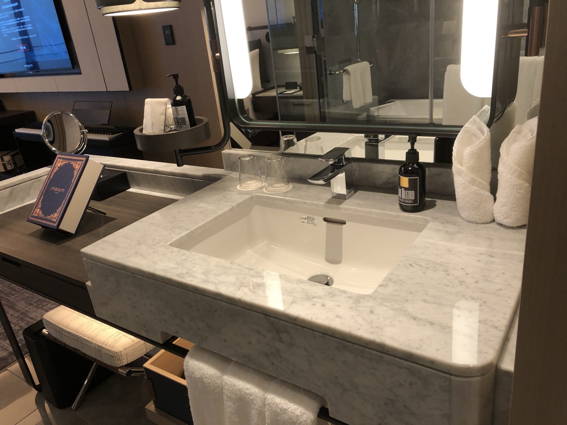 洗面台は高級感と清潔感があって、その周りには必要なものが揃っていました。