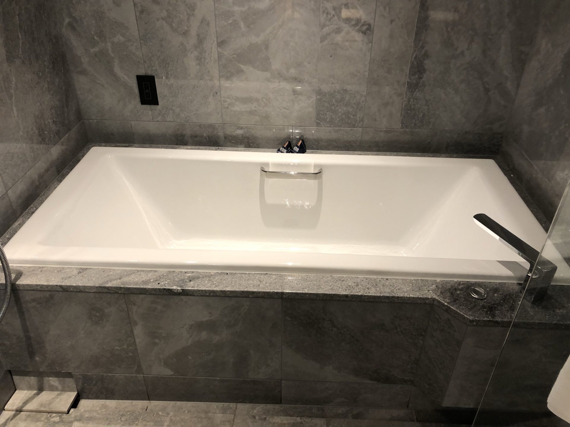 大理石の空間に広々と足を延ばせる浴槽があります。