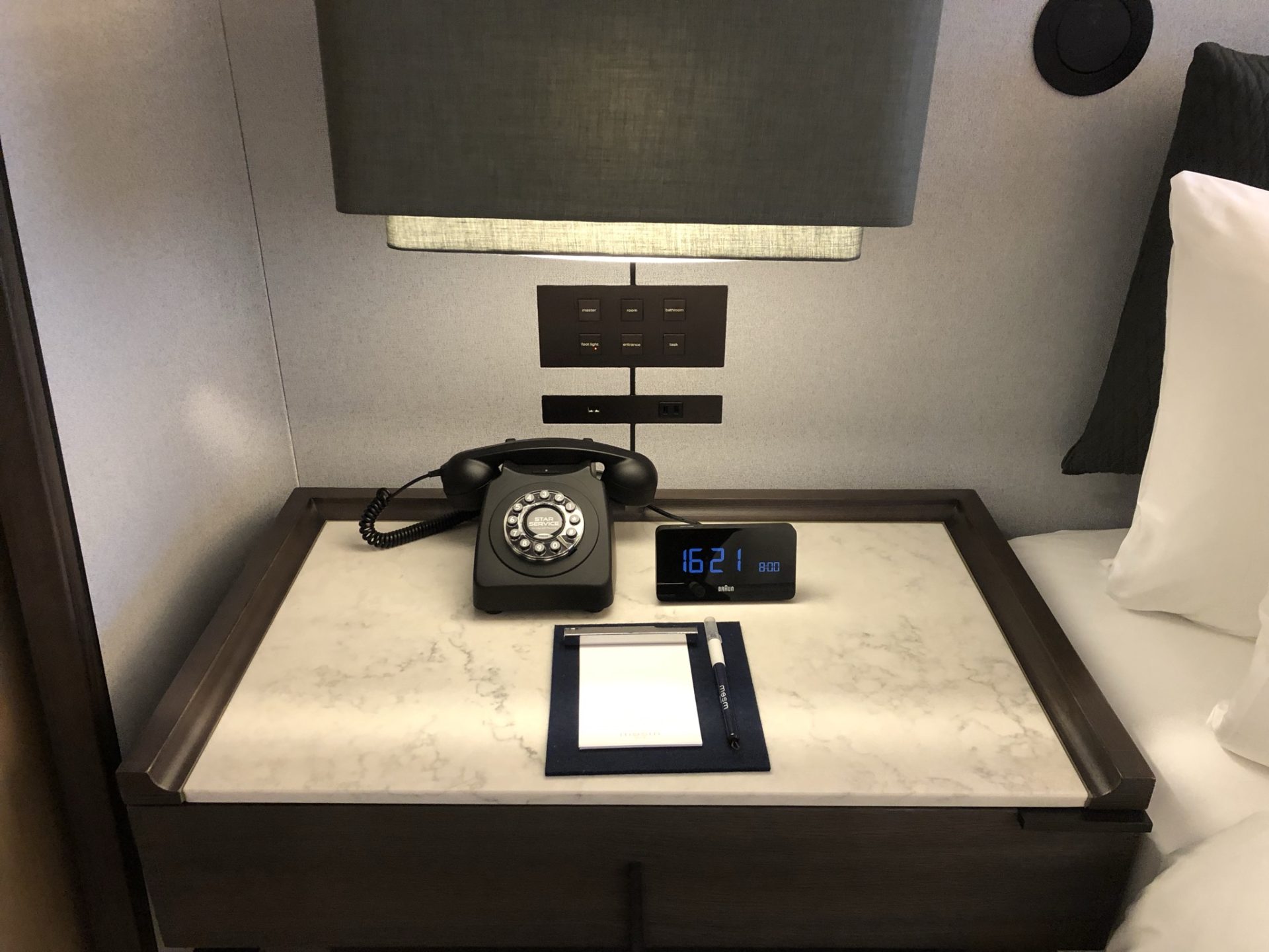 ベッドの横にはレトロな黒電話が。ダイヤルを回すのではなくダイヤル一つ一つがボタンになっていてすぐに内線を繋ぐことができます。