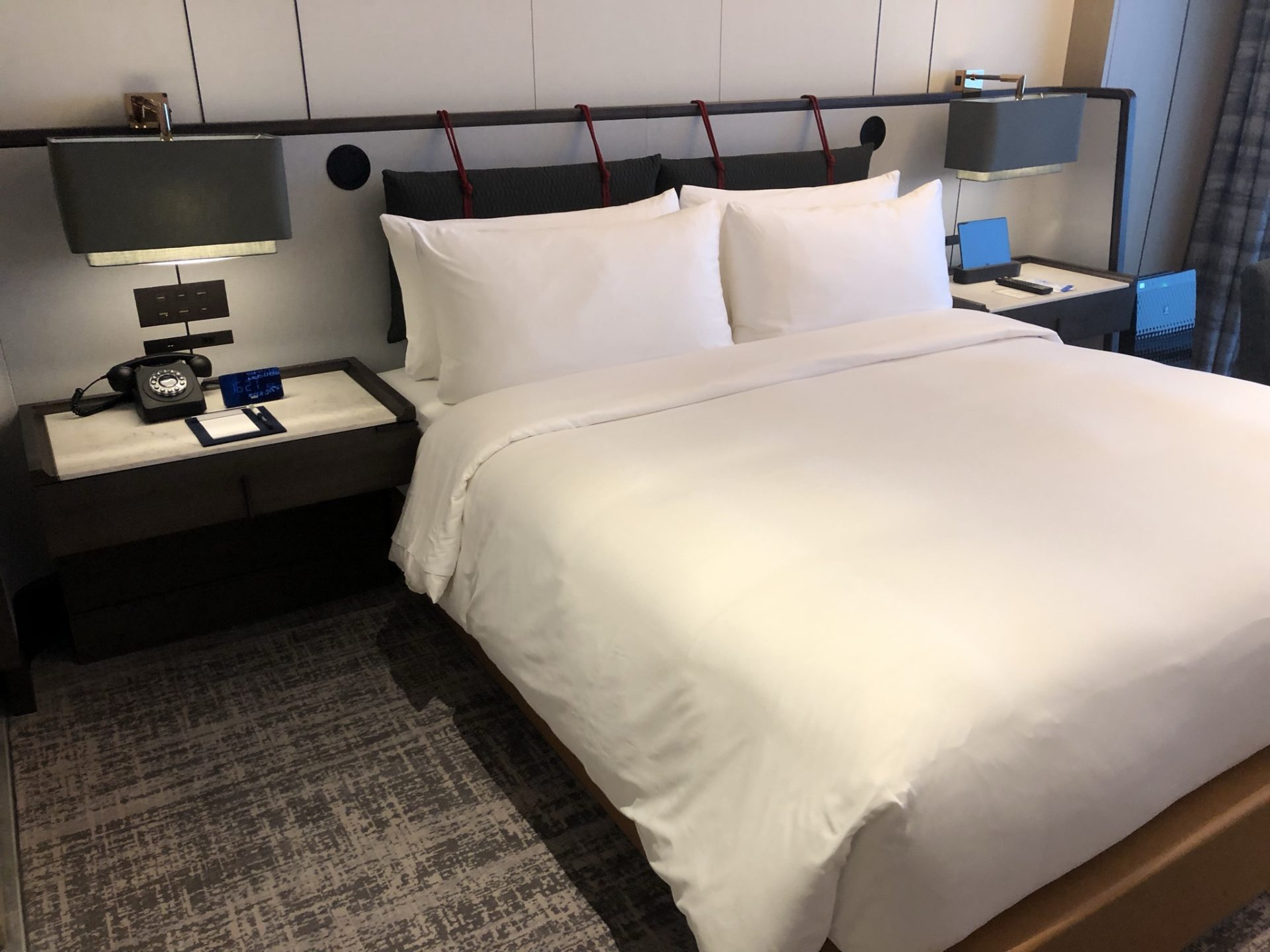 お部屋は白とグレー色が特徴的なシックな空間、そしてキングサイズのベッドは大きくて快適でした。